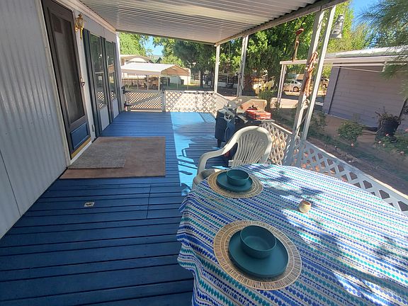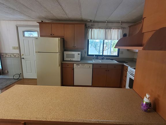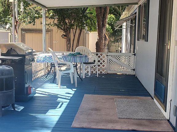 Charming two bedroom unit with adult landscaping around for wonderful summer enjoyment. Spacious outdoor front covered deck, freshly painted and inviting or if you want a very private setting - another adorable fenced in covered patio area out the back door. Home has brand new carpet throughout & boasts a brand new washer and dryer. Metal roof in place - large front windows for abundant natural lighting, add on living area and also a work/storage area, plus two sheds - one being a touch shed with work area and a loft. The other a metal storage shed to keep all the extras in. This 55+ park includes the water sewer, trash in the monthly rent payment. And offers a pickleball court, a dynamic clubhouse, and a community garden. Potential Buyers must be approved by the park.