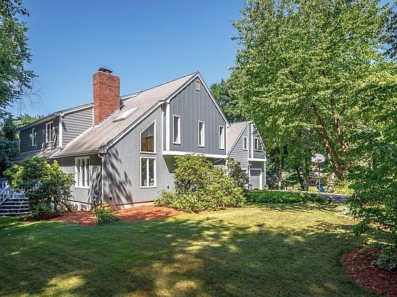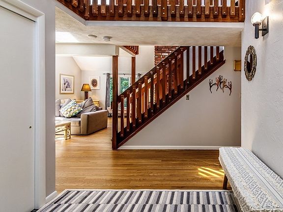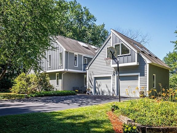 Large price reduction, priced to sell! Nestled in one of the best parts of town, this is a fantastic 4 bedroom home with a finished basement. Beautifully manicured grounds and a brick walkway and covered portico welcome you. Step inside to beautiful hardwoods throughout the first floor and stunning porcelain planks in the kitchen that has a brand new stainless steel gas range and refrigerator. An open floor plan with vaulted ceilings provides seamless flow from room to room, including a stunning center floor to ceiling brick fireplace. This home is filled with natural light, multiple sky lights, oversized casement windows and four Andersen sliding doors taking you to a fantastic wrap around deck. Upstairs you will sleep well in a primary bedroom with a slider to a private deck. Three additional bedrooms are sizable with good closet space. Over the garage is a substantial, private home office.