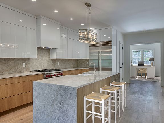 Stunning top of the line new Shelter Island home, nearing completion. Thoughtfully designed and built with great attention to detail, this 5 bedroom, 4 bath shingle style home is on a .96 acre corner lot in the sought after Shorewood area of Shelter Island. A wide, bluestone, covered front porch opens to spacious entry hall and great room with vaulted ceiling, gas fireplace, glass doors and clerestory windows overlooking a large mahogany, covered back deck and heated gunite pool beyond. The South West facing primary ensuite bedroom has a private bath, huge walk in closet and access to the back deck and pool area. On the East side of the living room is the well appointed kitchen with center island breakfast bar featuring a Taj Mahal leatherette quartz waterfall counter and overhang for seating; Wolf 6 burner gas range, stainless sub zero refrigerator, Bosch dishwasher, Sharp microwave and built in pantry. The dining room is to the left of the kitchen area and to the right is a study, bath with shower, convenient to the pool area plus a big laundry/mud room with white quartz counters and slate porcelain 12x24 floor tiles. The laundry room opens to a 582 sq. ft. two car garage with storage. The second floor has 2 bedrooms with full shared bath on the west side of the central media/family room which overlooks the living room below. The east side has 2 more bedrooms, one of which is a large dormitory style and there is a bath in the hall. The house has a full attic, additional storage and fully insulated 1757 sq. ft. basement with 9'6" foot ceilings and egress windows allowing future finished areas to be installed. This stunning property has many additional features with Rift and Quartered white oak flooring and crown molding throughout. Marvin windows, Kohler fixtures and sinks, mahogany trim with 1 and 3/4 2- panel doors. Scheduled for Autumn completion. Just minutes from beautiful Wades Beach with facilities and lifeguard plus easy drive to the South Ferry and the Hamptons.