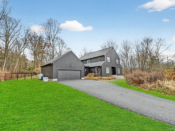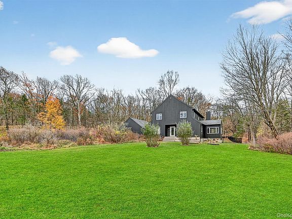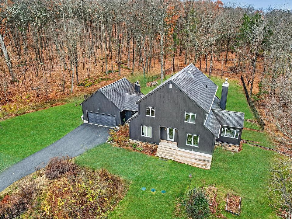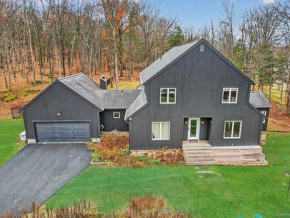 Discover modern living at its finest in this beautifully designed 2,870 sq ft contemporary home set on 4.1 stunning acres featuring a peaceful pond and a seasonal babbling brook. Offering wonderful privacy and an effortless indoor–outdoor lifestyle, this property is a rare retreat surrounded by nature. Inside, oak hardwood floors flow across both levels, setting a warm yet sophisticated tone. The lower level welcomes you with a sleek entry area leading into multiple stylish living spaces, including a formal living room and a sunken living room with fireplace and sliders that open directly to the expansive backyard. The bright eat-in kitchen features newer stainless steel appliances (dishwasher is brand new!) and is filled with natural light, perfect for everyday meals or hosting. Just off the kitchen, a beautifully versatile room with sliders to the deck offers an effortless indoor–outdoor dining experience. Whether used as a formal dining room or a casual gathering space, it creates a seamless connection between the home’s interior and the natural beauty of the backyard—perfect for al fresco meals, weekend entertaining, or simply enjoying the fresh Hudson Valley air. A recently updated full bathroom, a charming sunroom, laundry/mud room, and a spacious flex room—ideal for a den, playroom, sitting room, office, gym, or guest space—complete this level. Upstairs, the primary bedroom suite impresses with soaring cathedral ceilings, three walk-in closets, and a recently updated en-suite bathroom with modern finishes. Two additional spacious bedrooms share a full hallway bathroom, providing comfort and convenience for family or guests. Step outside to enjoy the peaceful deck overlooking your private natural landscape. The newly fenced backyard is perfect for pets, play, and entertaining, while the oversized two-car garage, whole-house generator, UV light water filtration system, and new gutter guards add everyday practicality and peace of mind. With unmatched privacy, contemporary style, updated amenities, and a breathtaking natural setting, this home offers the perfect blend of elegance, comfort, and escape.