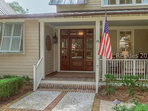 16 Parkman Street is a rare waterfront offering in the heart of Wilson Village, complete with its own private dock and eligibility for short-term rental. This 5-bedroom, 5.5 bath home showcases timeless Lowcountry design with exceptional attention to detail, including a copper roof, impact-rated windows, and reclaimed antique heart pine floors throughout. Mature live oaks frame the property, creating a canopy of shade and privacy. The main home offers four spacious ensuite bedrooms, including two primary suites - one on the first floor and another upstairs with its own balcony overlooking the inland waterway. A fifth bedroom suite is privately located over the two-car garage, ideal for guests. Outdoor living is highlighted by a fenced backyard, water views, and multiple porches for gathering. Just steps from Wilson Village dining, shopping, and the world-class amenities of Montage Palmetto Bluff, this home perfectly blends convenience, character, and coastal living.