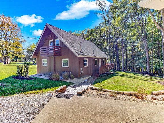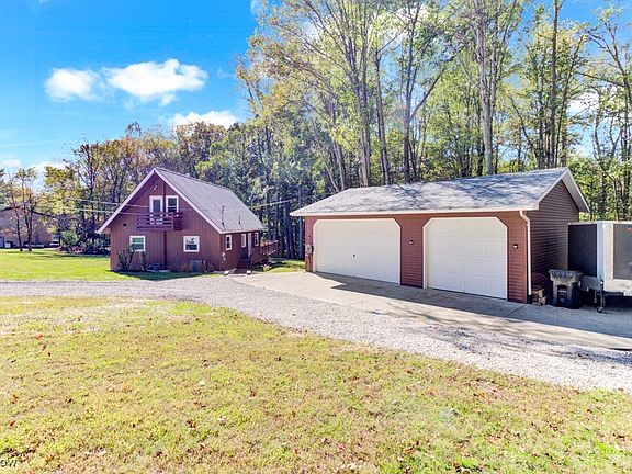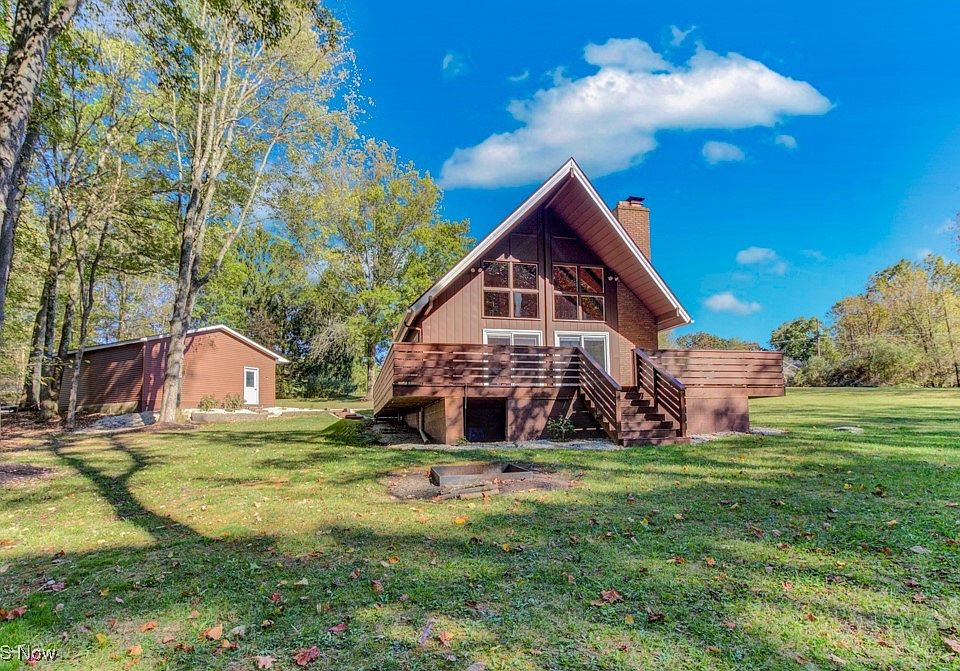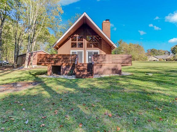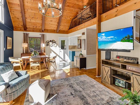 Welcome to your Lake Mohawk retreat! This stylishly remodeled A-frame sits on two lots bordering association property—offering a perfect blend of privacy, charm, and modern comfort. Step inside to find soaring cathedral ceilings and a bright, open layout that captures the essence of lake living. The updated kitchen features newer appliances including a dishwasher (2023) and refrigerator (2019/2020), seamlessly connecting to the dining area and spacious living room with newer sliding doors leading to the expansive deck—repainted in 2020 and ideal for entertaining or simply soaking in the peaceful setting. The main level offers two generous bedrooms and a beautifully remodeled full bath (2023). Upstairs, the inviting loft currently serves as an office, with a convenient laundry area and half bath, plus a comfortable bedroom with double closets and a private balcony for morning coffee or evening stargazing. This home is truly turn-key with newer carpet throughout (2024), solid interior doors, and mechanical updates including a gas furnace and central air (2023), updated electric panel, and a newer garage roof (2–3 years). The three-car detached garage (approx. 15 years old) offers plenty of space for vehicles, lake toys, and storage. Experience lake life at its finest—modern, move-in ready, and full of character—Enjoy all that the private, gated community of Lake Mohawk has to offer, including a 500-acre unlimited horsepower lake, three scenic beaches, an executive 9-hole golf course, tennis & pickleball courts, and so much more!