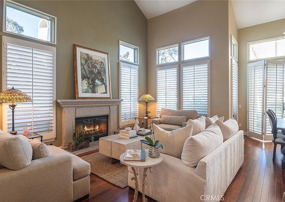 You won't want to miss this beautifully upgraded executive home with gorgeous views! Located in the gated community of Siena, no expense was spared and attention to detail is obvious throughout this beauty. Rich hardwood floors and fossil stone flow throughout most of the living areas. The kitchen features gorgeous custom designer cabinetry, granite counters, and top-of-the-line appliances. A breakfast nook looks out to a private courtyard with fountain. Huge windows and cathedral ceilings flood the home in natural light. The large primary suite features a fireplace and French slider that leads out to a balcony. The primary bath offers a jetted spa tub, beautiful marble shower and double sink vanity. Two additional spacious bedrooms share a jack-n-jill bath, also remodeled. Other features include plantation shutters throughout, ceiling fans in all rooms and updated fixtures throughout. A spacious backyard is a tropical garden with mature but well manicured foliage (including a productive Meyer lemon tree), artificial turf and stone patio, a bubbling fountain and panoramic views of the surrounding hills. Enjoy numerous amenities including the Siena pool and spa as well as the Marina Hills recreation center with pool, tennis, pickle ball, bocce ball, clubhouse and play area.