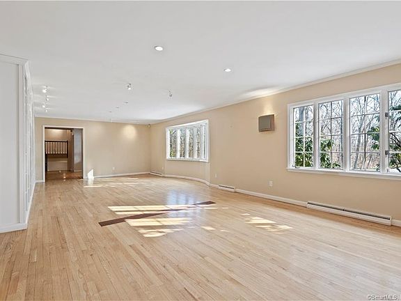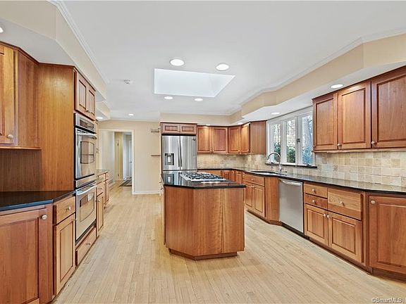 16 PINE RIDGE RD - Sprawling tri-level on a lovely quiet street that ends in a cul-de-sac. This house has it all Huge open living-dining room with built-in bookcases that stretches 33 feet The kitchen was designed by a chef, with high-end appliances, beautiful cabinets, and granite countertops. There is a sizeable breakfast room that opens onto a screened porch for enjoying summer evenings. The spacious family room has a wood-burning fireplace with a television already mounted above the fireplace, and windows overlooking the backyard. Down a hallway from the kitchen is a room that can be used for an au pair; it has a full bath and laundry across the hall, as well as its own entrance. Perfect for big-box storage, craft room, or office, as well. The oversized double garage has an electric car charger already installed. Upstairs are four spacious bedrooms, and two baths that were fully renovated eight years ago. Tons of closets. The primary bedroom has its own full bath with standing shower. The adjoining bedroom could easily convert to a dressing room if you wanted a larger private suite; the current owners use it as one of two private offices, each on a different floor. Downstairs is an enormous playroom, with sliders that open onto a patio and the backyard. There are two more rooms opening off the playroom. These can make excellent offices; bedrooms or bunkroom for the grands; gym; yoga room; or a music room.