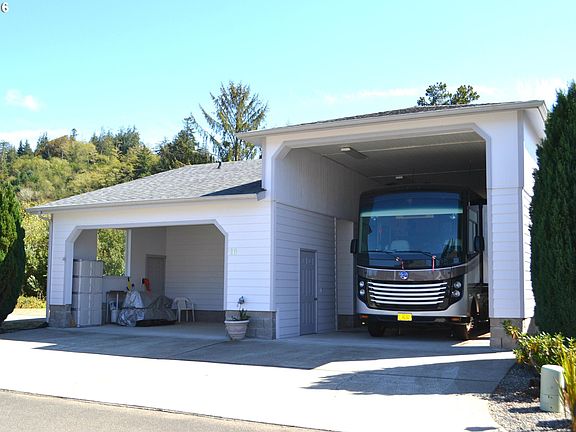 Osprey Point RV Village Resort custom home-built 2003. Great recreational area, near Oregon Dunes or walk to Ten Mile Lake! Perfect vacation, retirement/snowbird, or full-time residence. Home features open living rm/ kitchen, bedroom, bathroom and laundry room downstairs, w/sleeping area & 1/2 bathroom upstairs, nice deck, view of forest area. 2 car garage. 45X17 RV carport.
