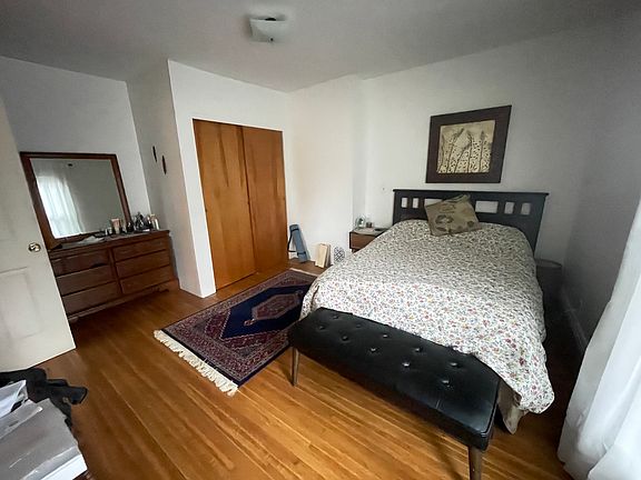 This bright apartment has hardwood floors and a really large bedroom closet.