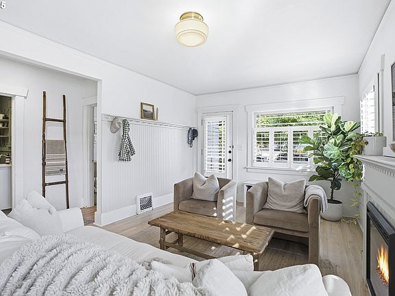 New Price and Open House this weekend! Welcome to this charming Johns Landing bungalow filled with timeless details throughout. Step inside to find the sun-filled living room centered around a cozy fireplace. The main level is framed by refinished original hardwood floors, 10-inch baseboards and detailed trim work––keeping that 1920’s character alive. The spacious kitchen, an updated full bath, and bedroom featuring bead-board wainscoting complete the inviting main floor. Upstairs, you'll find a loft/office space and a proper primary suite offering views of Mt. Hood, walk-in closet, and a dreamy bathroom featuring quartz counters with double vanity, tile floors, tongue and groove accent walls, marble-tiled shower, soaking tub, and vintage-inspired fixtures. Outside, you’ll find plenty of room to relax and entertain. The fenced backyard is surrounded by mature landscaping, offering amazing privacy. A covered pergola allows you to enjoy the outdoors even on those not-so-sunny days. Out front, a white picket fence and covered porch add timeless curb appeal. You’ll also appreciate the extra-long driveway and detached garage. Located in one of Portland’s most walkable neighborhoods, you’ll love being just minutes from local coffee shops, cafes, and multiple trails and walking paths along the river. Just 5 mins to downtown, 10 mins to Lake Oswego, and 20 mins to the airport, Johns Landing offers a rare blend of convenience and community.