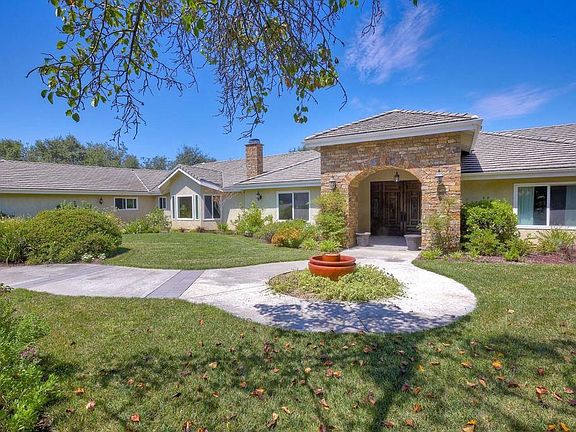 Never leave home! This private custom spacious 3818 sq ft. single story residence is located in the beautiful park-like setting of the 24-hr guard gated community, Rolling Hills in Fallbrook. This is one of the few with direct access to the riding trails and facilities. The property spans 2.61 acres of usable space and boasts amazing views to the north of rolling hills and snow-capped mountains in the winter. The home features 4 bedrooms, 1 optional bedroom, 3 full bathrooms and a large office. Two bedrooms and 1 bath are at the opposite end of the house with a door for complete privacy. Beautiful oil-brushed oak floors and travertine floors. The kitchen has all Thermador appliances, custom Cherry wood cabinets, soft-close dove-tailed drawers and leather granite counters for a beautiful and luxurious feel and look. Master on-suite bath "spa" includes soaking tub and separate walk-in/roll-in shower. Spacious 3 car garage with extra storage area. Lots of usable space for horses, barn, corral, grove or vineyard. Additionally, the home includes desirable amenities such as a gorgeous pool, fully owned solar panels for energy efficiency, EV charging, and a well with a 5,000-gallon storage tank for sustainable water supply. With solar and a drinking and irrigation water well, you can say goodbye to high utility bills. The combination of a luxurious interior, outdoor pool, scenic views, and eco-friendly features make this property an incredible choice for those seeking both comfort and the beauty of nature.