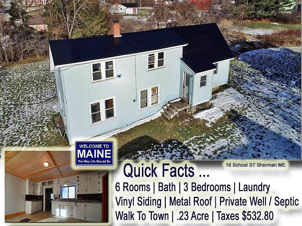 Affordable, Available Low Cost Home! Need One Of Those? Dead End Side Street Quiet Location. Enjoy The Sherman Ball Field, Playground Proximity. Get 1st Floor Bedroom & Full Bath, Laundry Room! Two More Bedrooms Up! Vinyl Sided, Metal Roof. Quick Occupancy! Looking For A Starter Home To Climb Up And Out Of The Rent Rut? Start Owning, Stop Leasing At 16 School ST Sherman ME! Level Lot, Use This Low Cost Home As Your Vacation Getaway Up In Northern Maine! Rent Out When Not Using For Profit! Overhead Storage On New Addition. Mud Room Entry! Lots To Like For The Money! Video. Questions? Reach Out, Here To Help! Local Bank Financing Works Best For Many Reasons! Need A Bank Pre Approval And Want Help Knowing What Options Are Available For The Best Deal? This Home Location Makes Walking To Grocery Store, Post Office Possible. Welcome To The Friendly Village Of Sherman ME... Around 900 Residents. Explore Area.. Over To Baxter State Park, The Rec Trails, All The Lakes Here In 'Vacationland'.