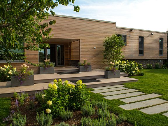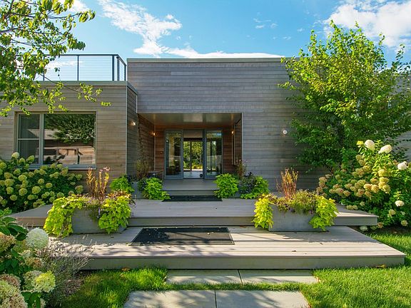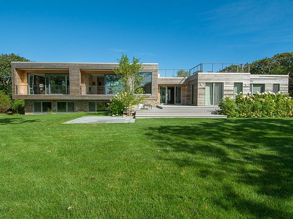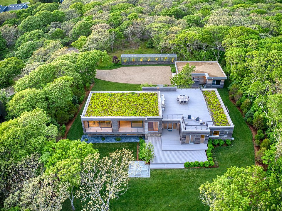 A rare new Katama Contemporary Beach House in a premier location bordering Edgartown Bay Road on 1.7 acres with ocean views. This custom designed multilevel home features a 1,300 sq. ft. roof deck complete with an outdoor kitchen and a green sedum roof garden. The property also has a detached two car garage with an adjacent studio, half bath and storage space. This property is professionally landscaped including a screened-in row of mature Blueberry bushes. The home was designed by evoDomus LLC to the latest energy efficiency standards. Property is sold ''Turn Key'' all furnishings included except for some personal items. Optional membership to Mattakesett Resorts allows use of Pool, Tennis Courts, Gym, Children Programs and more. Photos courtesy of evoDomus LLC.