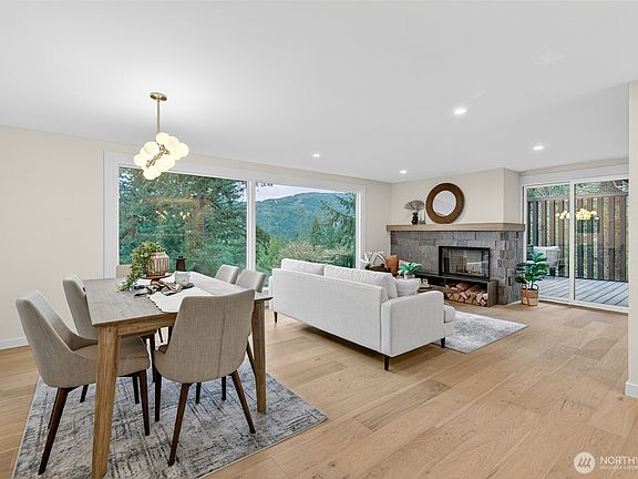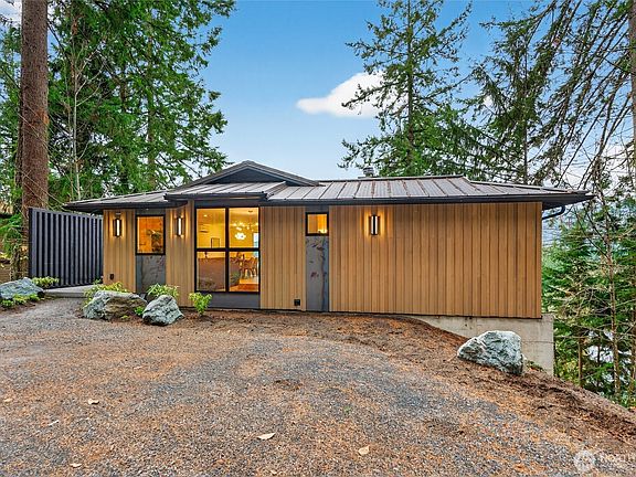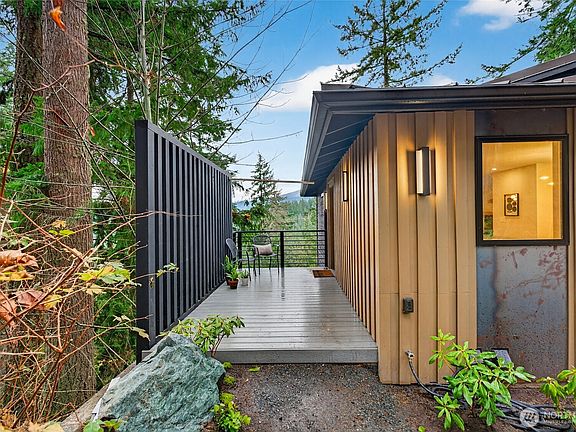 Discover a one-of-a-kind PNW tree-house retreat nestled in the woods with stunning lake views. Completely remodeled, it features new electrical, plumbing, windows, HVAC, four decks, and numerous additional upgrades. Luxury details include natural stone fireplaces with a custom black-and-steel hearth, wide-plank white oak floors, and vertical-grain cedar exterior accents. Architect-designed details enhance form and function in a seamless blend of nature, style, and craftsmanship.