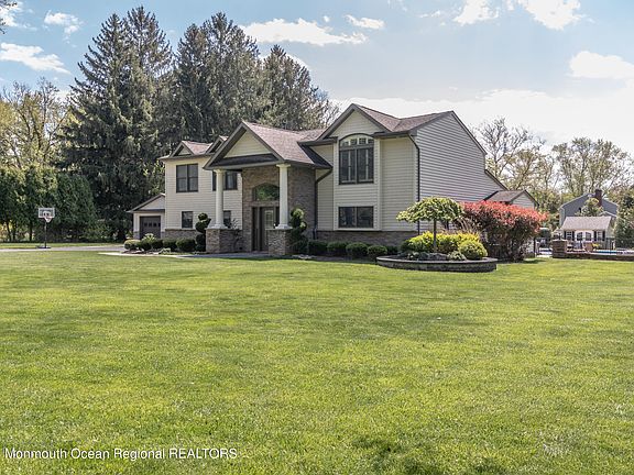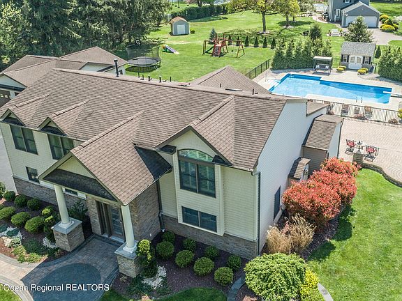 Please submit your Best & Final offers by Wed, May 3rd at 2pm. This meticulously maintained and tastefully decorated 4/5 bedroom, 3 full bath home is ready to impress. Step inside to a breathtaking 2 story foyer with gleaming porcelain tile floors and a dramatic wood and wrought iron staircase. A bright and airy 1st floor boasts an open floor plan complete with dining room, starring a gas fireplace, a large living room with full wall sliders, decorative moulding and wet bar. The expansive kitchen is complete with wraparound breakfast bar, butler's pantry, custom window treatments and new appliances. The sunroom with soaring vaulted ceilings, is filled with natural light, making it the perfect place to relax. A versatile rec room adds additional living space and can be used to fi your needs. The downstairs bonus room can be used as an office or 5th bedroom. Upstairs, you'll find the primary bedroom boasting soaring ceilings, custom shutters and a spacious walk-in closet. The newly renovated ensuite bath with double sinks, soaking tub, luxurious shower and radiant heated floors. You'll find 3 generous sized bedrooms, as well as another newly renovated full bathroom, a laundry room with built-in cabinets, for added convenience, and a walk up attic with abundant storage. Live like you're on vacation when you step outside to a private 1 acre impeccably landscaped yard with a resort-like saltwater pool surrounded by a 2700sq feet of paver patio and a pool house. An oversized 2 car garage is complete with a workshop and storage loft. Don't miss the opportunity to live on a beautiful tree-lined street in a fantastic Holmdel neighborhood!
