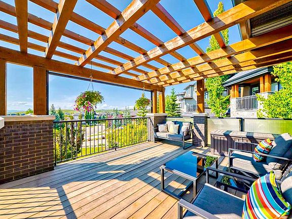 Experience over 6,500 sq ft of exceptional luxury in this custom-built estate, ideally perched to capture sweeping views of the mountains and valley below. Designed with sophistication and comfort in mind, this meticulously crafted home offers 5 bedrooms, 6 bathrooms, and a heated triple-tandem garage—perfectly blending timeless elegance with modern functionality. A grand, light-filled foyer welcomes you with soaring ceilings and leads into a dramatic living room anchored by floor-to-ceiling windows and a statement fireplace. The formal dining room and expansive family room provide effortless flow for entertaining, while the gourmet kitchen is a chef’s dream—featuring dual quartz islands, top-tier appliances, and a hidden walk-in pantry for seamless organization. The main level also includes a private home office, custom mudroom, and two stylish powder rooms for guests. Upstairs, discover four generously sized bedrooms, a cozy study nook, a secondary laundry room, and a luxurious primary retreat with dual walk-in closets and a spa-inspired ensuite complete with steam shower and soaking tub. The fully finished walkout basement is an entertainer’s dream—featuring a custom theatre room, spacious rec room, sleek wet bar, temperature-controlled wine cellar, and a private guest suite. Premium upgrades are found throughout, including triple-pane windows, rich hardwood flooring, central air conditioning, steam showers, and a fully integrated smart security system. Outdoors, the professionally landscaped grounds are equally impressive, with a west-facing backyard that showcases mountain vistas, a covered patio, and a stunning cedar pergola—ideal for relaxing or entertaining year-round. Located minutes from Calgary’s top-rated schools, Westside Recreation Centre, the LRT, and Stoney Trail, this is more than a home—it’s a lifestyle of refined living and panoramic beauty.