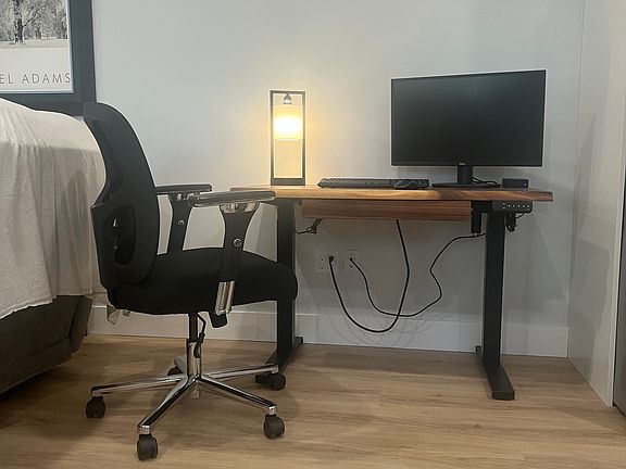 Sit-stand desk with a second monitor and office chair for remote work