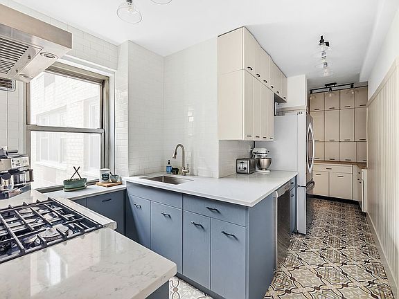 Adjacent to the dining room is a walk-through butler's pantry with a wine refrigerator and drinks station, opening to a large, renovated and windowed kitchen featuring ceiling-height, vintage cabinets, new Italian porcelain tile floors, and stainless steel appliances (Bosch dishwasher). Beyond the kitchen is a sizable staff room or 4th bedroom with a full bath and storage closet, currently set up as a quiet home office large enough for two users.