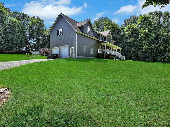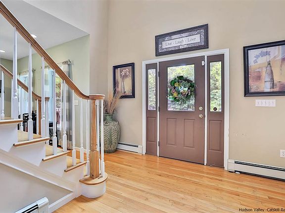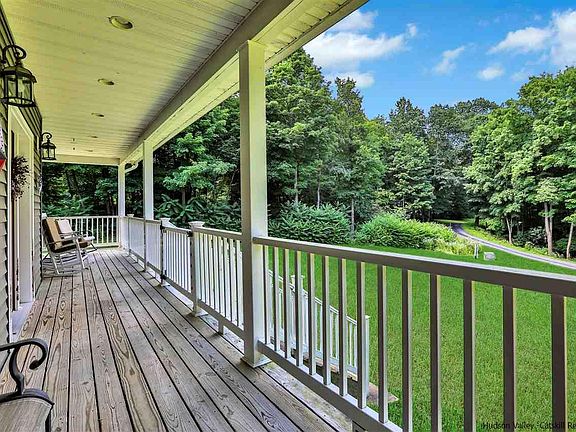 Located on a quiet cul-de-sac, you will find this custom-built 2,466 SF Colonial. Set back from the road on a private 4.6 acre lot, this beautifully built 3 bedroom, 2.5-bathroom home is everything you could dream of in a country setting. Just 90-miles from NYC and minutes from the Hamlet of Highland and the center of New Paltz, life here offers world-class climbing, hiking, trail systems, farm-to-table cuisine, local wineries, a thriving art scene, and breathtaking landscapes. Built in 2004, the home is comfortable and spacious, offering a simple and desirable floorplan with sun-drenched spaces. Enter the home into the soaring two-story foyer, leading into the main living spaces featuring a formal sitting room/den, sizeable formal dining room, spacious enough to dine with family and friends from near and far, sprawling great room/family room with wood-burning fireplace insert, large country kitchen offering plenty of space for the chef in the family, with a large eat-in area. Rear doors lead to the beautifully built covered rear porch, the perfect place to dine or simply enjoy outdoor living. The ground floor also features a powder room for guests. The second story features a primary suite with an ensuite primary bathroom and a walk-in closet. Two additional bedrooms are found on the second floor with a shared second full bathroom with tub/shower. The massive unfinished bonus room and full basement both offer unbelievable storage, or potential for additional finished square footage should you desire. Two car garage, space for gardens, solar panels for energy efficiency, and plenty of opportunity for outdoor living. A stone's throw from all the amenities, yet with the privacy and seclusion you desire with Hudson Valley living.