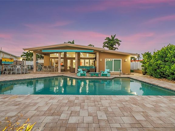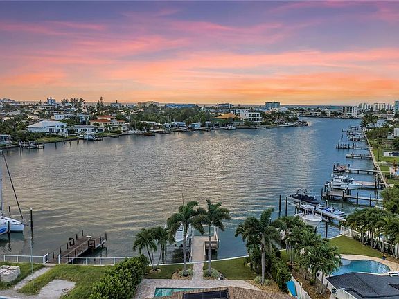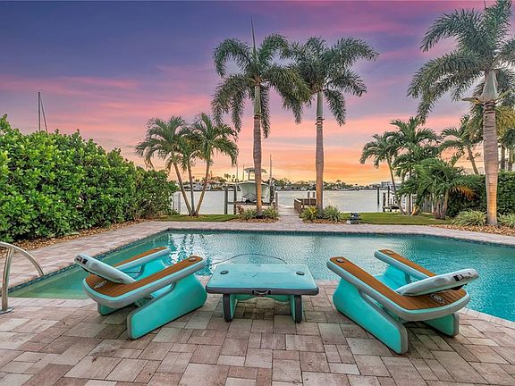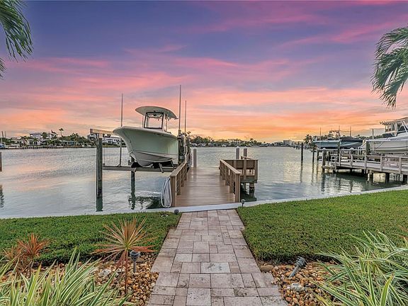 Completely updated gem in Paradise Isle, this spacious 3-bedroom, 2-bath modern residence features soaring vaulted ceilings and an open-concept layout that creates an inviting, airy atmosphere perfect for both relaxing and entertaining. As you enter, natural light radiates throughout, and you eyes are drawn directly out to the covered lanai overlooking your private pool— ideal for soaking up the Florida sunshine or hosting unforgettable gatherings. Enjoy direct access to the water with your own dock and lift, perfect for boating and waterfront fun, and a 5 minute boat ride to the Intercoastal and Gulf of Mexico. End your day with breathtaking sunset views that make every evening feel like a special occasion from your lounge and fire pit, bar or al fresco dining table. Inside, open living and kitchen spaces feature timeless travertine flooring, adding warmth and sophistication throughout. The dining area is an entertainer’s dream, featuring a custom bar with LED lighting, a 90-bottle wine cooler, and a spacious island designed for gathering, with jaw dropping Calacatta Emerald Quartz. Expansive windows frame serene waterfront views, creating the perfect backdrop for both intimate evenings and lively entertaining. The chefs kitchen features Thermador appliances including a gas 5 burner cook top, driftwood colored cabinets, Aspen White Calcite countertops, and storage galore. The laundry room also has a coffee bar and full size GE Profile washer and dryer, and a 2 car garage and additional exterior shed offer plenty of storage for all your water toys. A thoughtfully planned split-bedroom layout provides privacy, while the master suite offers a true retreat with its spa-inspired en-suite: steam shower, dual vanities, and a spacious walk-in closet. Large windows throughout the home invite in natural light and showcase peaceful waterfront views, creating the perfect setting for both everyday living and entertaining. A quick walk or golf cart ride will take your toes to the powdery sands of beautiful Treasure Island beach, and just 20 minutes to downtown St. Petersburg and I-275 North & South. Don't miss your chance to experience the perfect blend of island charm and modern comfort in this waterfront paradise!