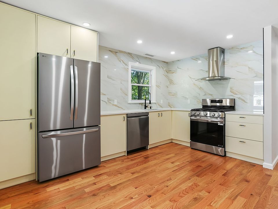 Ranch-style apartmentCompletely renovated unitShaker-style cabinetryTile floorTwo generous bedroomsNewer appliancesBeautifully updated kitchen