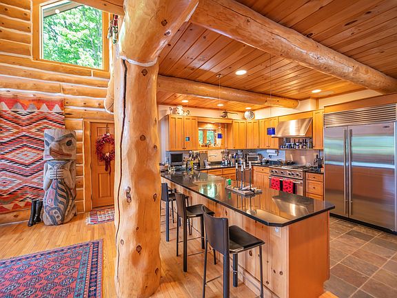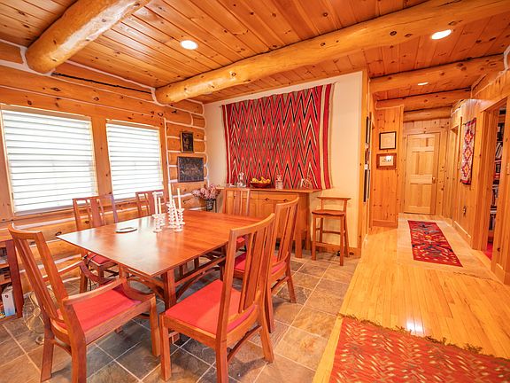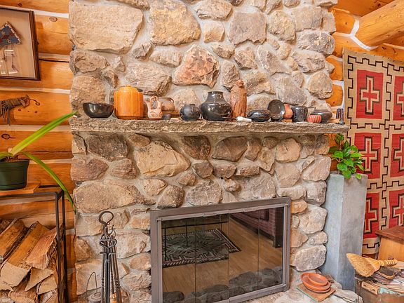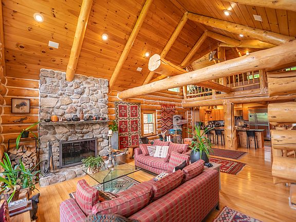 Absolutely stunning log home just north of the main entrance of the Mount Snow ski resort. This pristine property sits nestled on a very private yet easily accessibly 7 acre parcel just north of the mountain, with stunning direct views of the trails, ridgeline, and sunsets beyond. Watch the fireworks and torchlight right from your living room. The property has been beautifully landscaped and has exposed ledge, perennial gardens, a pond, outdoor entertaining space including decks walkways, and direct access to the vast snowmobile trail system. Inside you are treated to a gorgeous log home style with natural exposed woodwork throughout, a large great room with floor to ceiling stone fireplace, extensive windows for great natural light, a sizeable dining area off the custom chefs country kitchen, a beautiful vaulted second floor primary suite with tiled shower and soaking tub, 2 additional main floor guest rooms with a full bath, a large loft open to the main living area, ideal for office or entertainment area, a full finished lower level family room, gym, one more guest bedroom and full bath, additional bonus room, and a 2 car garage for your vehicles and snowmobiles. Truly the best combination of style, location, proximity, and privacy, that you can likely find anywhere around. A must see!