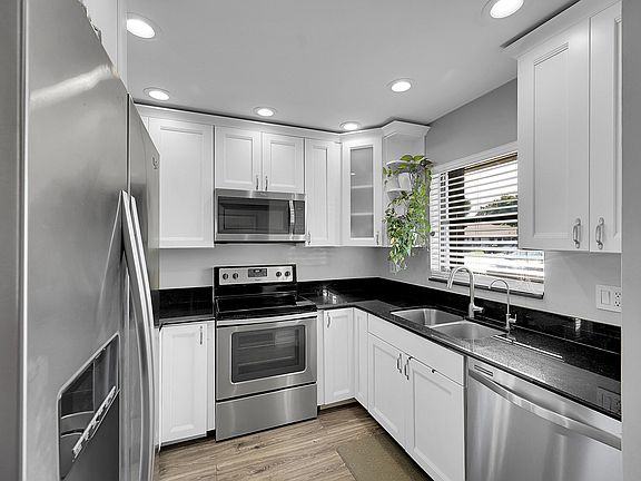 This beautifully renovated 2-bedroom, 2-bath villa in the gated community of Dos Lagos offers the perfect blend of comfort, style, and peace of mind. As a corner unit, it provides extra privacy, natural light, and an ideal layout featuring a screened-in patio with additional outdoor space for a grill or lounge chairs -- perfect for relaxing or entertaining.Step inside to discover white shaker cabinets with soft-close doors, stainless steel appliances, and a reverse osmosis water filtration system in the updated kitchen. The home features vinyl flooring throughout, recessed lighting in every room, no popcorn ceilings, and high ceilings in the main living area, giving it a spacious and modern feel. The washer and dryer are conveniently located in the patio. Enjoy added peace of mind with full accordion shutters, security cameras, a brand-new roof (2025), and a new water heater (2023).