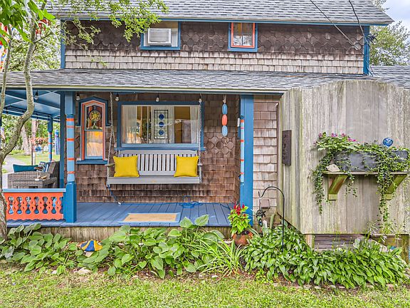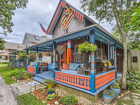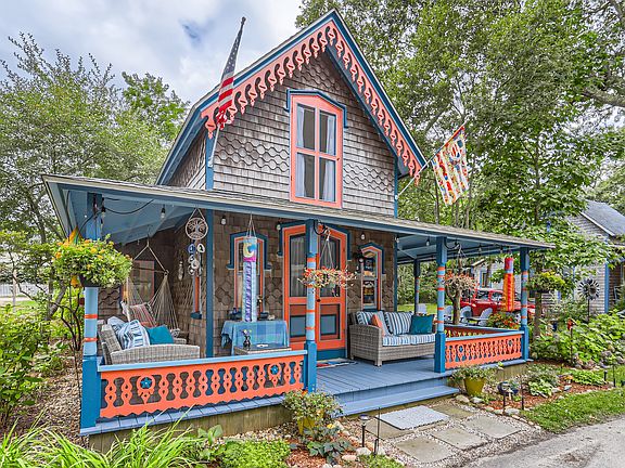 This is the magical ginger-bread cottage located in a tranquil part of the Martha’s Vineyard Campground Historic District, it was built on 1870. This charming, turn-key cottage underwent a beautiful historical renovation in recent years. The minute you enter the cottage you have the overwhelming feeling of a well-loved home. Attention to detail was placed into every nook and cranny of this historic home. The renovations between 2018 and 2020 included a new kitchen, bathroom, plumbing, electrical, insulation, heating, roof, painting, sprinkler system and much more. The first floor offers a spacious living room with three open-plan rooms for entertaining with family and friends, a gorgeous fully equipped Kitchen/Dining room that would the envy of any chef, a large bathroom with clawfoot tub, and a designated laundry/storage room. The cottage can comfortably accommodate 4-6 family members with two cozy bedrooms upstairs and additional queen sofa bed on the first floor living area, perfectly made for a long night’s sleep after taking in all that Oak Bluffs has to offer. The home boasts a large wrap around porch featuring numerous seating areas, private yards with extensive gardens (double Campground lot). The cottage also has the rare Campground luxury of two private parking spaces at the home.