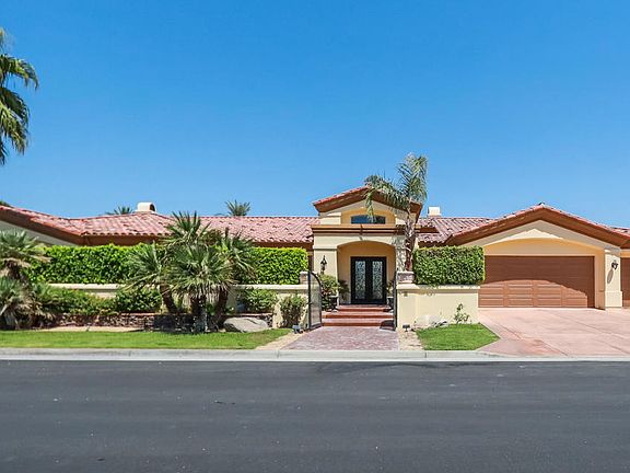 Welcome to 16 Villaggio Place! This grand home, located in the exclusive Villaggio on Sinatra community of 30 custom built homes at nearly 4500 square feet and boasts a fantastic central desert location. This home is just a short drive from the ritzy El Paseo shopping district and the Palm Springs International Airport, and closer yet to Sunnylands, the Ritz Carlton and Disney's new Cotino development.The exterior gate of Villaggio on Sinatra opens to the community's beautiful central fountain; one never tires of this central feature! When arriving at the home, you are welcomed by the custom iron and glass front gate, which is flanked by two imported and hand carved Italian marble urns. Within the front courtyard, you are also greeted by a four-tier fountain, a small curated rose garden and a gorgeous custom iron and glass double doors which can open for the desert breeze while remaining locked in place. As you enter, the spacious hall and living room creates magic and style with a massive fireplace, a sunken entertaining bar and huge glass sliders to the pool.The kitchen has a large island, two dishwashers, two sinks, a walk in pantry and a walk in crystal/dish/goblet room and Thermadore appliances. The open concept kitchen, dining, and family room all have direct pool access. The private backyard has numerous patio seating and dining areas with stunning mountain and palm tree views. The sparking pool with tanning shelf, built in BBQ and lounge area make this outdoor retreat a delight for family and friends.The primary suite, located in a separate wing, has Mountain Views, pool access and fireplace. This private retreat has its own office, two large separate closets, two separate vanities, two separate water closets and a soaking tub and large walk in shower. The home office also has private courtyard access and built in storage or it can easily be used as a formal dining room.The two hall bedrooms are currently used as an attached casita, complete with a living room with private outdoor entrance for guests, and a spacious bedroom with en-suite bathroom and large closet. This suite can also be used as two bedrooms with en-suite bathroom. The fourth bedroom is en-suite with a pool/garden access. The large three car garage has storage and A/C, complete with a separate bonus room with A/C, currently being utilized as a chess/TV room with private exterior entrance