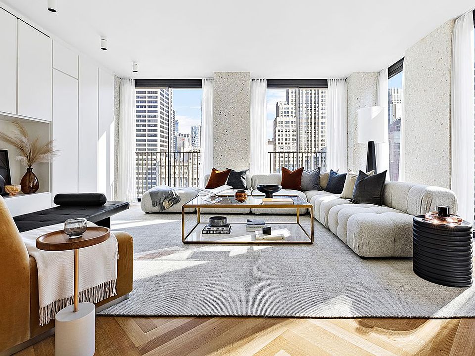 Residences at The Bryant, located at 16 West 40th Street, sit atop a boutique hotel and amenities include 24-hour attended lobby, lounge, fitness center with sauna, and access to the Branch Club with fireplace and full bar overlooking Bryant Park.