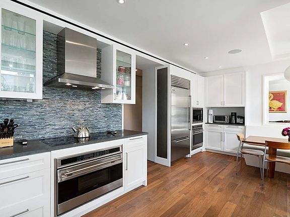 Accessed by a semi-private elevator landing, this high floor apartment is in triple mint condition. The Living Room/Dining Room expanse is spacious and has a fabulous flow and feel. It opens to a large Chef's Kitchen with top-of-the-line appliances, walk-in pantry and a beautiful windowed eat-in area. Completing the 10th floor is a generous size bedroom with an ensuite bathroom. Other features on this floor include a built-in office nook, full-size washer/dryer, powder room and central air conditioning.