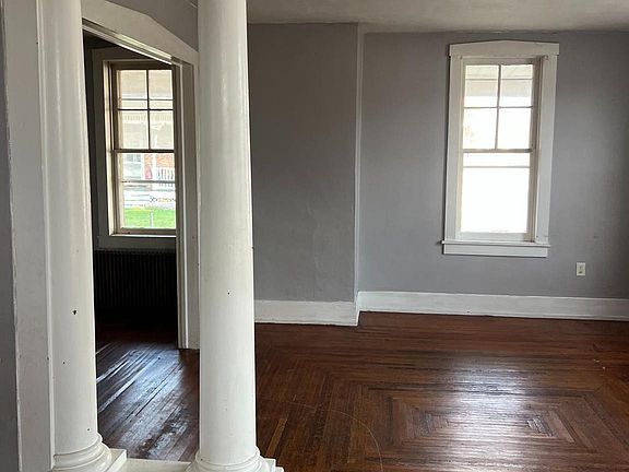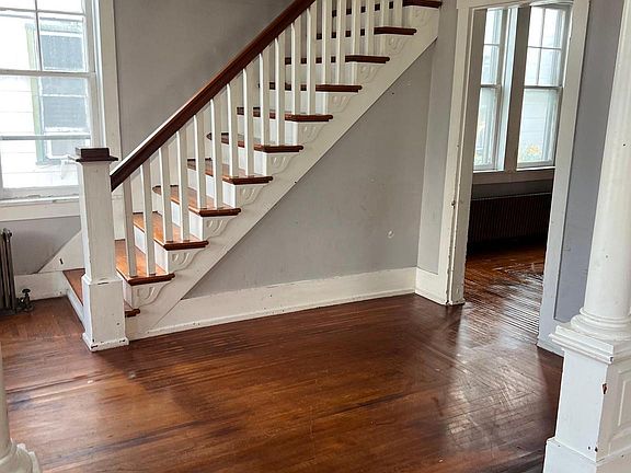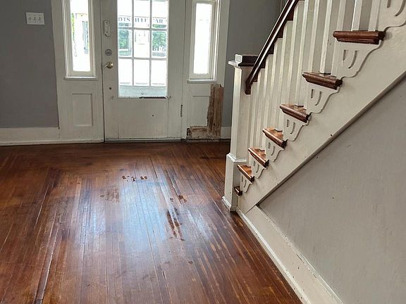 Original woodworkEat-in kitchenLarge center foyerAttached laundry roomOriginal hardwood flooringOpen staircaseRectangle inlay wood pattern