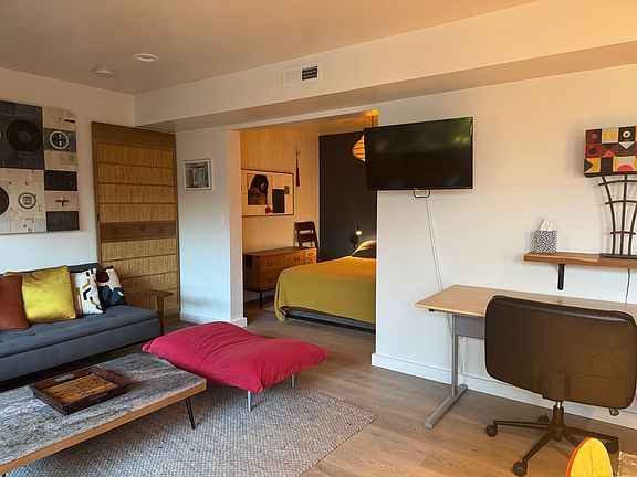 Private, unique and modern, art-filled apartment on Mercer Island on Lake Washington, 12 minutes from Seattle. Fully furnished with a full kitchen and washer/dryer, in unit. Private patio and dedicated off-street parking. Pool and air-conditioning available in the summer. One block from public transportation. Lovely walking trails and parks. Pets are allowed. All utilities included, as well as high-speed internet. Separate entrance. Storage available.