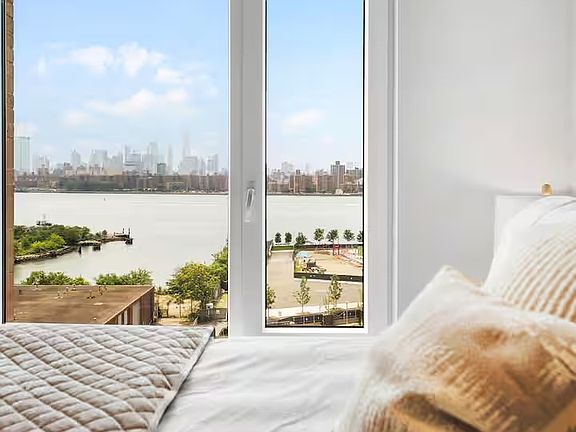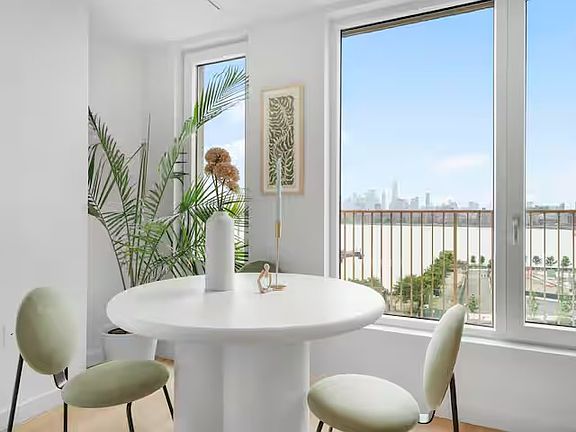 The kitchen leads into a sun-drenched living room with floor-to-ceiling windows, offering breathtaking southwest views of the water, stunning sunsets, and the iconic Manhattan skyline. Whether you're unwinding on the couch or enjoying a meal, this space is perfect for relaxation and entertaining.