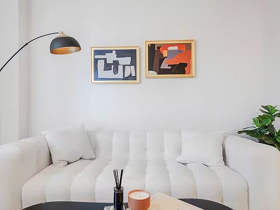 The kitchen leads into a sun-drenched living room with floor-to-ceiling windows, offering breathtaking north-east views, and the iconic Manhattan skyline. Whether you're unwinding on the couch or enjoying a meal, this space is perfect for relaxation and entertaining.