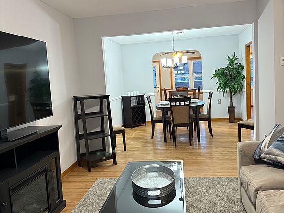 The upper level presents a classic, inviting layout. You'll find a large living room, a formal dining room, a cozy breakfast nook, and a kitchen featuring a brand-new stainless-steel gas range and microwave. The original, timeless hardwood floors and freshly painted walls create a bright and welcoming atmosphere.