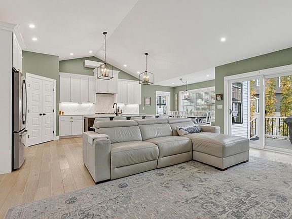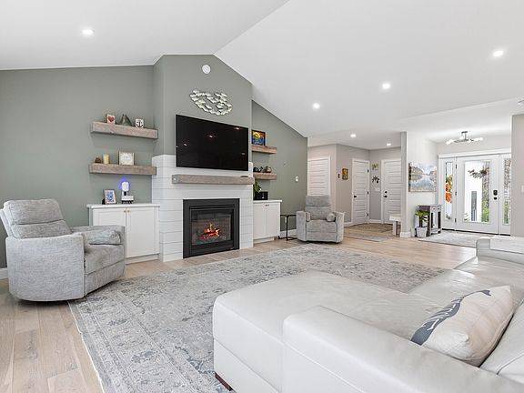 Step onto the welcoming farmers porch, then into a sun-filled open floor plan that immediately impresses. The main living area features cathedral ceilings, a gas fireplace with nickel gap paneling and custom built-ins, and wide-plank flooring that adds warmth and character.