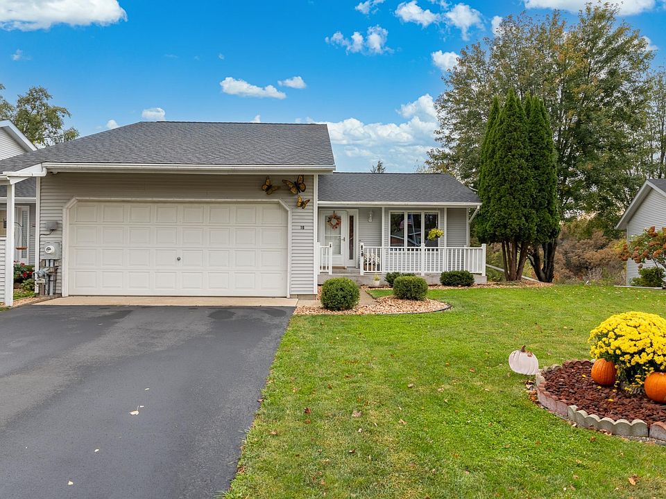 Welcome to this clean 3 bed / 2 bath one-story townhome tucked on a quiet no-outlet street with a private backyard offering great sunset views. Enjoy an open concept main level with vaulted ceilings, lots of windows, a spacious living room and kitchen with SS appliances & center island, a large primary bedroom with walk-in closet, PLUS a relaxing 3-season porch that overlooks the valley. The finished basement includes a cozy family room with wet bar, two additional bedrooms, a 3/4 bath, and a walkout patio door for easy access to the backyard and the covered concrete patio below the 3-season porch. Conveniently park inside the 24 ft deep attached two-car garage this winter. Outside you will find a lush lawn with ample space for gardening or play, beautiful landscaping, and a well-maintained driveway. Recent updates include a new roof, new 3-season porch windows and basement patio door, 1-year-old dishwasher, water heater, and washer. This is a great place to start a new chapter and enjoy peaceful small-town living. No monthly HOA fees. Owners split the cost of hazard insurance. Schedule a private tour today.