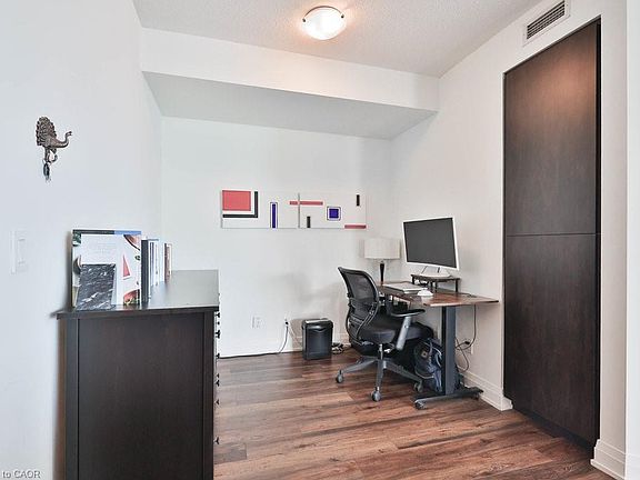 Welcome to 1059 sq. ft. of bright, spacious living with panoramic lake and city skyline views. With soaring 9-foot ceilings and floor-to-ceiling windows, natural light fills every corner, creating an open and airy atmosphere. The well-appointed split-bedroom floor plan ensures both comfort and privacy, while the open-concept kitchen, living, and dining areas are perfect for everyday living or hosting guests. The kitchen features full-sized stainless steel appliances, granite countertops, and a convenient breakfast bar. A versatile den provides the ideal space for a home office. Wake up to stunning lake views from the primary suite, spacious enough for a king-sized bed, complete with his-and-hers closets and a private ensuite bath. Rarely available above grade (4th floor) parking and locker add incredible convenience. Residents of this exceptional building enjoy an array of world-class amenities including two fitness centres, an indoor pool, hot tub, sauna, steam room, squash and tennis courts, theatre, guest suites, and an outdoor BBQ area—this building truly has it all. The maintenance fee also includes heat, hydro and water so you only pay for internet/cable. Just steps to Scotiabank Arena, Union Station, the Financial and Entertainment Districts, Harbourfront, and Sugar Beach, with quick access to the Gardiner Expressway or Billy Bishop Airport, this location is unmatched.