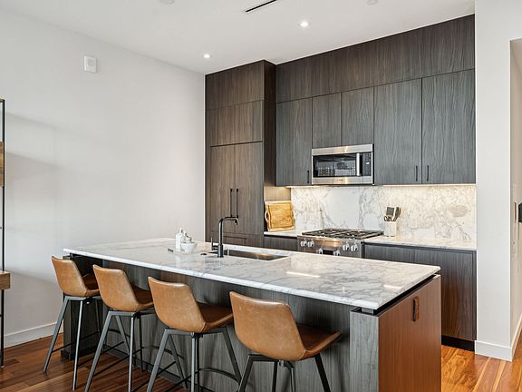 Inside, refined elegance meets effortless comfort. A fully integrated smart lighting and shade system enhances convenience, while thoughtful upgrades include a custom bar and coffee area and bespoke shelving in the powder bath. The kitchen is a showpiece with Calacatta marble counters and backsplash and custom Italian cabinetry providing expanded storage. The California-style closet features premium organizational shelving—an elevated upgrade beyond the standard finishes. The spa-inspired primary bath offers a glass-enclosed marble shower and separate soaking tub, creating a serene private retreat. Designer finishes elevate every detail, creating a true lock-and-leave urban haven.