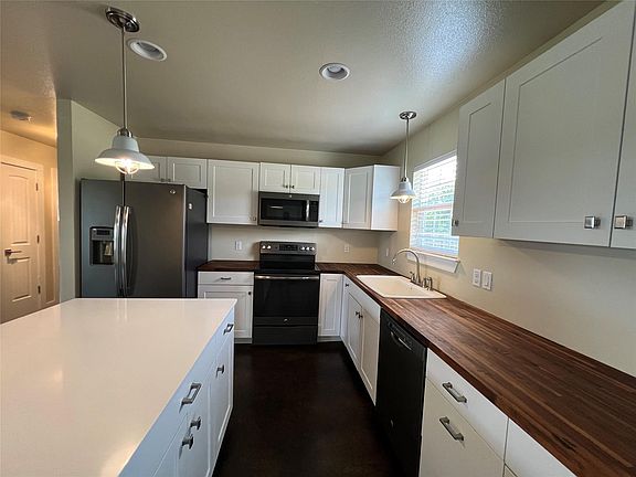 Stainless appliancesReally nice master bathIsland in the kitchenButcher block countertopsLarge fenced in yard