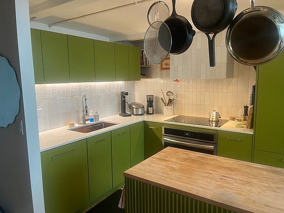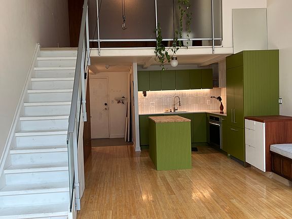 Tucked in the heart of Kensington Market, this 1 bedroom hard loft has been lovingly renovated. No millennial grey here! The kitchen pops with green and walnut, with thoughtful cabinetry, a brand new induction stove, concealed double-door fridge and dishwasher, even a drying rack hidden above the sink.