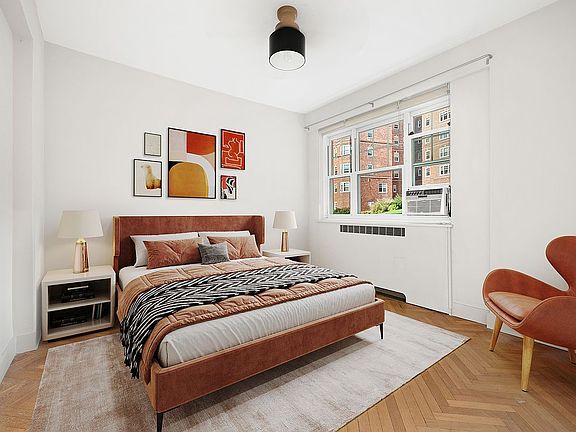 The spacious bedroom easily accommodates a king-sized bed with room for a seating area. The windowed bathroom has been fully renovated with timeless, classic finishes: slate floors, white subway tile, and Kohler fixtures. Additional highlights include custom-outfitted closets, high ceilings, recessed lighting with Lutron switches, and steeply discounted bulk utilities (cable $10/month and reduced electric charges).