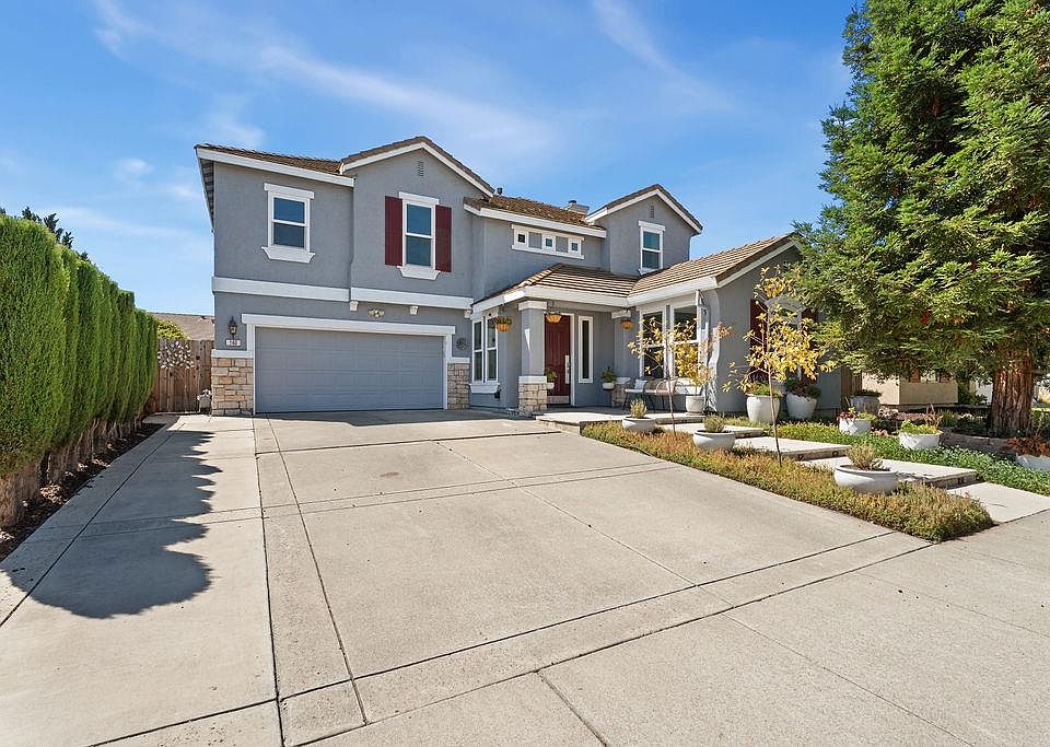 Welcome to 160 Cakebread Circle, a beautifully updated and exceptionally spacious home offering 5 bedrooms, 4 full bathrooms, and 2 versatile flex rooms perfect for home offices, guest rooms, or creative spaces. Designed for flexibility, it's ideal for multi-generational living with a junior primary suite on the main level featuring a fully tiled wet room and walk-in closet, plus an upstairs primary suite with soaking tub, separate shower, large walk-in closet, and private toilet room. The open kitchen, dining, and family room create an inviting hub for entertaining, highlighted by granite countertops, upgraded cabinets, hardware, and appliances. Soaring double-height ceilings greet you at the entry, while fresh interior and exterior paint, all new energy-efficient windows, dual-zone HVAC, smart home features including keyless entries, blackout cellular blinds, and ceiling fans throughout ensure year-round comfort. Outdoors, relax or entertain under a covered redwood deck and pergola with fan, surrounded by lush new sod, raised planter beds, fruit trees, a dog run, and smart irrigation. Upgraded fencing, gates, and garage access add convenience all just 2 blocks to Witter Ranch Park, steps to the canal walking path, mile to shopping and I-5, and 3 miles to I-80!