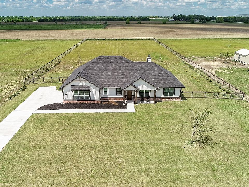 Modern living, rustic charm, and peaceful views! This newer Riverside home is on a fully fenced 1.3 acre lot minutes from downtown Ennis and Lake Bardwell with easy access to 287 & I-45. Farmhouse exterior boasts a front porch, stained wood front door, side entry garage, extended driveway pad, and covered back patio. Open concept plan also offers a dedicated office, a fireplace, a generous mudroom, and a separate laundry room with ample cabinets and additional sink tucked away behind a sliding barn door. The kitchen is spacious with an island, oversized sink, granite counters, wood shaker cabinetry, large walk-in pantry, and an eat-in dining space. Wood floors in common areas, tile in the kitchen and baths, carpet in the bedrooms. Split bedroom floor plan maximizes privacy. Primary ensuite has oversized walk-in shower, dual sinks, and separate water closet. Full gutters, cordless blinds throughout, sprinkler system, and installed security system. Pristine condition inside and out!