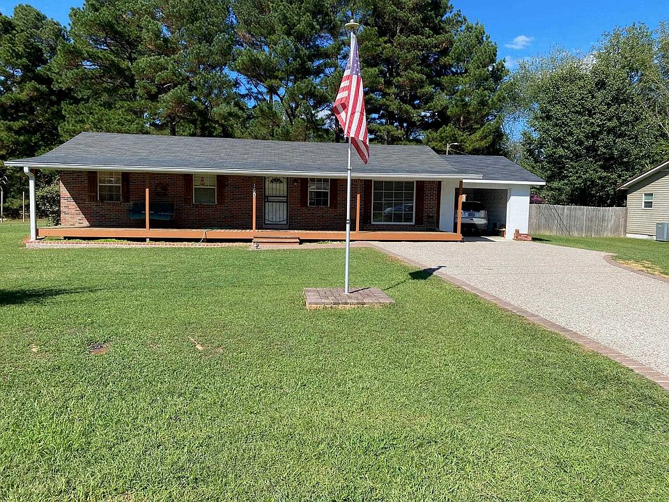 Lots of extras with this 3 bedroom, 1 bath brick home that has been recently renovated. Built-in custom cabinets, granite counter top with matching island. Newly added living room with a large picture window. Single car garage with automatic garage door. The garage leads to a state-of-the-art above ground storm shelter(safe room). 3 new security doors, inside doors and windows, paint and gutters. There are 2 adjoining storage buildings to hold all your items. Newly added 38'x8' front porch and back deck. Nicely landscaped with brick and concrete laid driveway, flower beds, and a flag pole.