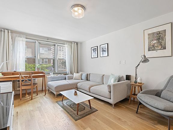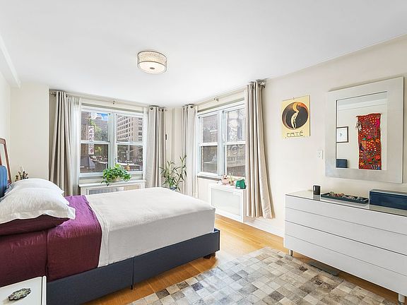 The B line is the largest line in the building. This spacious apartment has ample closet space and is a corner apartment. The renovation includes select white oak wood floors, open kitchen , beautiful cabinetry, stone counter tops , coffee bar, server with wine refrigerator and, stainless steel appliances and back splash. The bathroom is renovated and has a window, its decorator with white and colored glass tiles and glass shower door There are. city quiet windows in the bedroom, this apartmentis is light facing east and nortth.. There is a video intercom , live in super, and laundry in the building. Storage units available for rent. . West of Third Avenue. . Pets allowed with approval, Immediate and unlimited subletting permitted with a sublet fee. Pied-a-terre’s and parents buying for children are also permitted. This building has excellent financials and Low monthly cost.. actual and sttaged photos of bedroom and living room