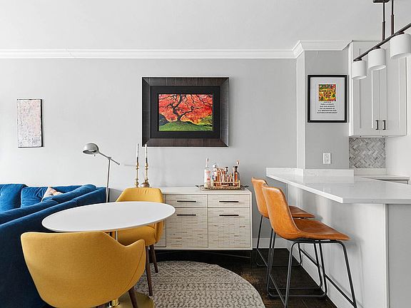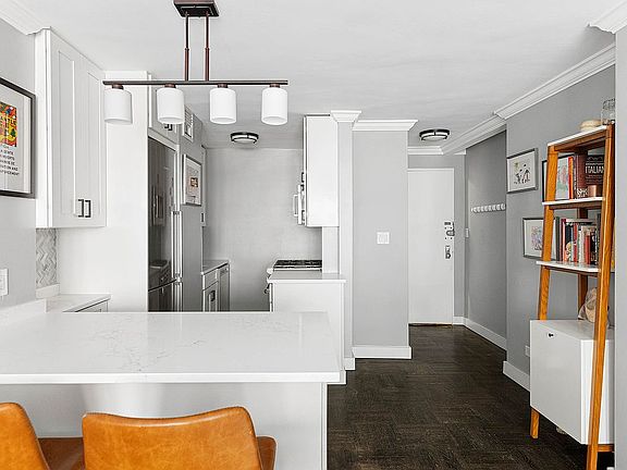 NEW! This is your opportunity to live in Prime Kips Bay in a mint-condition home with open views and amazing light. Residence 6A is an oversized 1-Bedroom / 1-Bathroom apartment with enormous East-facing windows that welcome you with incredible sun the moment you step into the graceful entryway. The expansive living room provides space for both living and dining. An updated chef's open kitchen with custom cabinetry and Caesarstone countertops with breakfast bar , herringbone-patterned mosaic tile backsplash, stainless steel appliance package including Liebherr refrigerator, Wolf range, Bosch dishwasher and wine refrigerator. The king-sized bedroom is infused with an abundance of natural light and is outfitted with two of the four custom closets throughout this special apartment. Crown molding and dark-stained parquet floors are the remaining highlights of Apartment #6A.