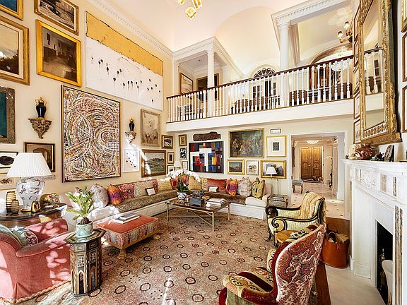 The second floor is anchored by a furnished mezzanine that overlooks the garden level rooms. This flexible space lends itself to dramatic entertaining. On this floor there is also an elegant antique English pine-paneled library with floor-to-ceiling bookcases and a fireplace, as well as a lovely guest bedroom with ensuite bath.