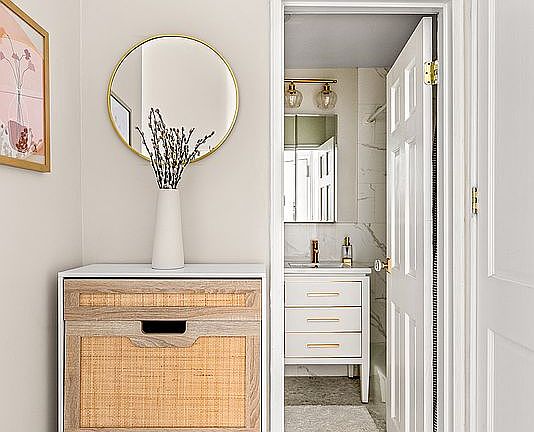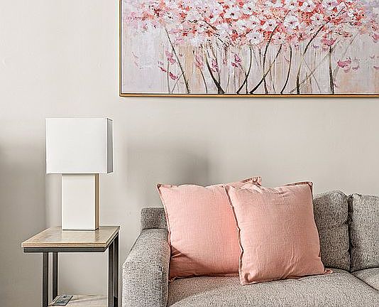 Every detail has been thoughtfully considered. The residence features hardwood floors, premium solid wood doors with designer Emtek hardware, Benjamin Moore Aura paint, and Levelor blinds throughout. The chef’s kitchen is equipped with full-size stainless steel appliances and abundant counter space, while dimmable recessed lighting and updated electrical wiring with hidden TV and cable connections add both functionality and style. The bathroom showcases Moen fixtures, marble floors, and a modern Kohler Reach toilet. The smart layout easily accommodates a queen bed and sofa, maximizing both comfort and flexibility.