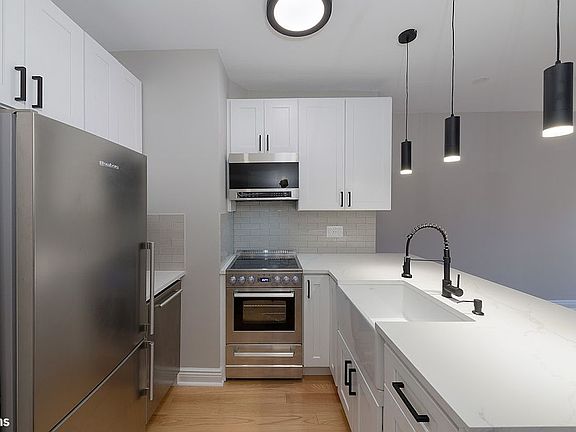 Living room: bright southern exposure through 2 large windows floods the entire apartment with natural light. State of the art custom designed kitchen. White quartz countertops, subway tile backsplash, farm sink, top of the line stainless steel appliances (including Blomberg refrigerator) and pendent lighting. Enjoy the luxury of the renovated bath, which features: glass stall shower with cascading waterfall shower. recessed vanity mirror, floor to ceiling subway tile. The south facing bedroom fits a queen sized bed and has an extremely large custom closet.