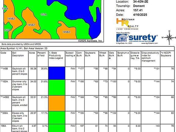 160 MOL vacant acres of highly productive Class A Ogle County farmland. Located just 1 1/2 mile east of Rochelle, IL at the corner of Ritchie Road and South Locust Road. Square 160 acre field with 154.2 cropland acres and 4 acres grass waterway. Owner operated farm for years. Class A Soil Productivity Rating of 134.8: Major soils include: Saybrook, Drummer, Elpaso, and Elburn. Ogle County PIN #'s: 25-34-400-002 and 25-34-400-003 Taxes for 2023: 8,073 14.800 per acre. Total price 2,368,000.