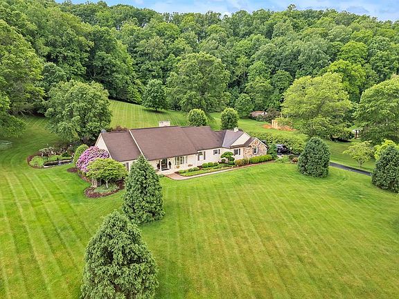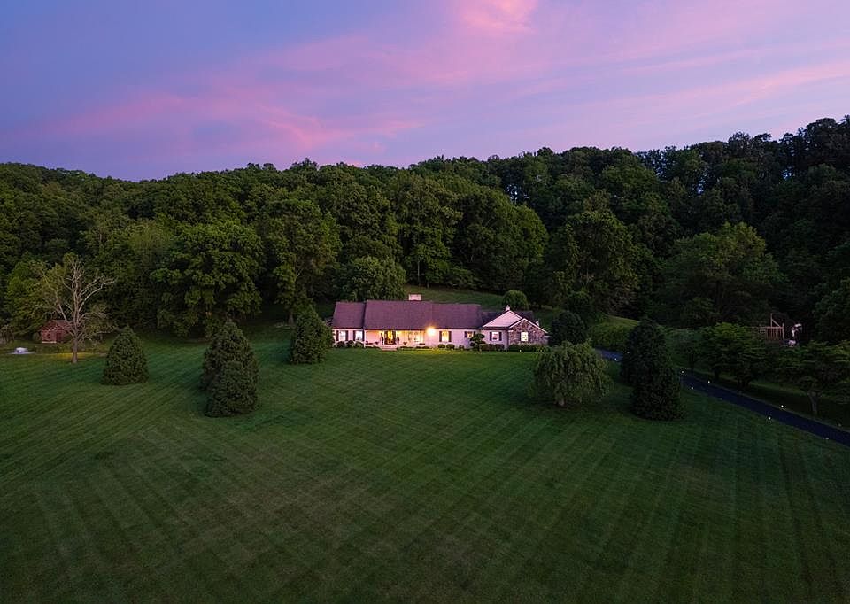 This beautifully maintained 9 acre, 5,000-square-foot estate features an impressive four-bedroom, three full bath, two half baths with magnificent views, walking trails and complete privacy. The home boasts two stone fireplaces and numerous recent upgrades and renovations throughout. The main-level primary suite includes a fully renovated ensuite bath, while a second primary suite is located on the upper level. The main-level ensuite bath is completely updated with a stunning blue glass-tiled shower, sliding barn-style glass doors, a ceiling fan with heat, and a large walk-in closet. The property also features two unique ponds, one filled with giant Koi fish. The home offers a formal entry foyer and a beautiful formal living room with five curved French-style windows and a marble fireplace. In the family room, you'll find a stone-walled propane fireplace, custom glass cabinetry, wooden beams, and a new sliding glass door that opens to a large covered patio with marble decking. The fully remodeled kitchen includes soft-close cabinetry, upgraded countertops, top-of-the-line appliances with custom stone backsplash and walls. A redesigned pantry with two sliding barn doors and a broom closet adds function and charm. The formal dining room comfortably accommodates an eight-person seating arrangement. The finished basement includes a new kitchenette with a two-burner stove, refrigerator, freezer, and sink, along with a spacious entertainment area featuring a stone fireplace and a brand-new half bath. A large, separate area provides ample storage space. Front and rear walkways have been updated with all-new premium pavers. Additional features include new triple-insulated garage doors and openers. Privacy and elegance throughout! Schedule a showing to experience this beautiful estate today!